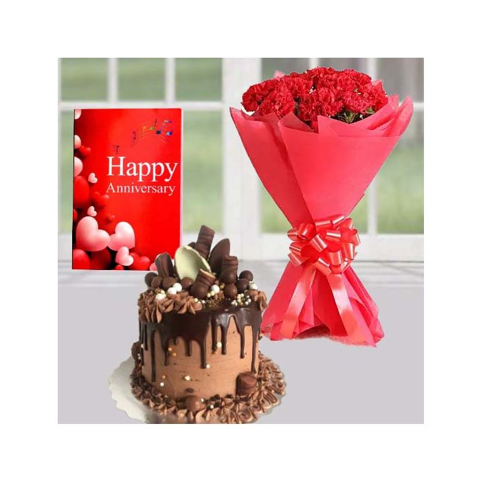 Looking for a thoughtful and memorable gift for your anniversary? Look no further than this stunning bunch of 10 red carnations, chocolate explosion cake, and greeting card combo! The beautiful red carnations are the perfect symbol of your love and affection, and the delicious chocolate cake is sure to satisfy your sweet tooth. The greeting card lets you express your heartfelt sentiments in a personal way. This gift is sure to make a lasting impression!