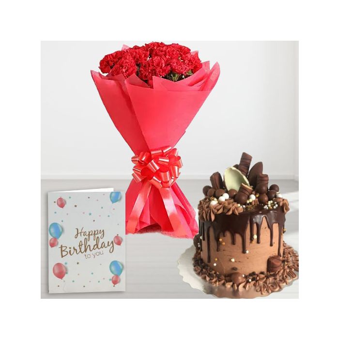 Looking for a gift that is sure to impress? Look no further than this gorgeous bunch of 10 red carnations, chocolate explosion cake, and birthday greeting card. The perfect way to show your loved ones how much you care, this gift is sure to make a lasting impression.The vibrant red carnations are the perfect way to show your affection, while the chocolate explosion cake is sure to satisfy any sweet tooth. The birthday greeting card is the perfect finishing touch, making this gift truly memorable. So don't wait any longer, order today and let your loved ones know just how much you care!