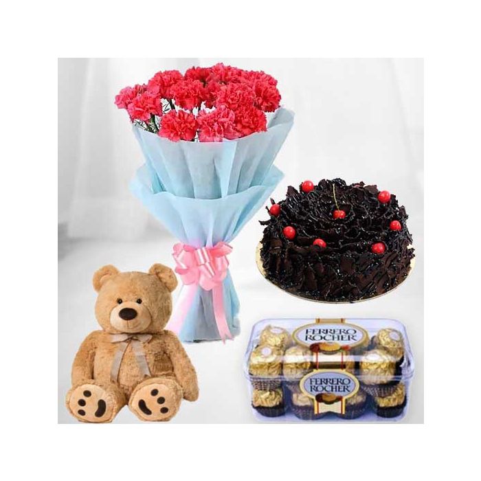 Looking for a gift that is sure to delight? Then look no further than this gorgeous bunch of 10 red carnations with chocolate fantasy cake and 10 inch brown teddybear. Perfect for any occasion, this gift is sure to make a lasting impression. The chocolate cake is absolutely delicious and the teddybear is simply adorable. Plus, the added bonus of 16 Ferrero Rocher chocolates makes this gift even more special. Order now and make someone's day!