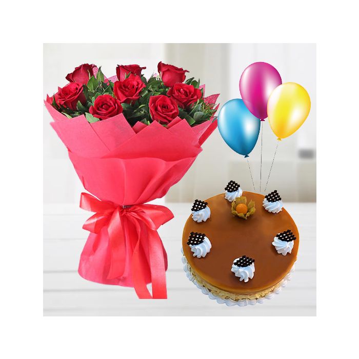 Product Description 5 | Bunch of 10 red roses with butterscotch fresh cream cake with 3 blown balloons |
