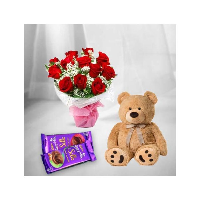 Delight your special someone with this gorgeous bunch of 10 red roses, accompanied by a 6 inch teddy bear and a set of 2 Dairy Milk chocolate bars. The perfect way to say 'I Love You', this delightful gift is sure to make them smile from ear to ear.