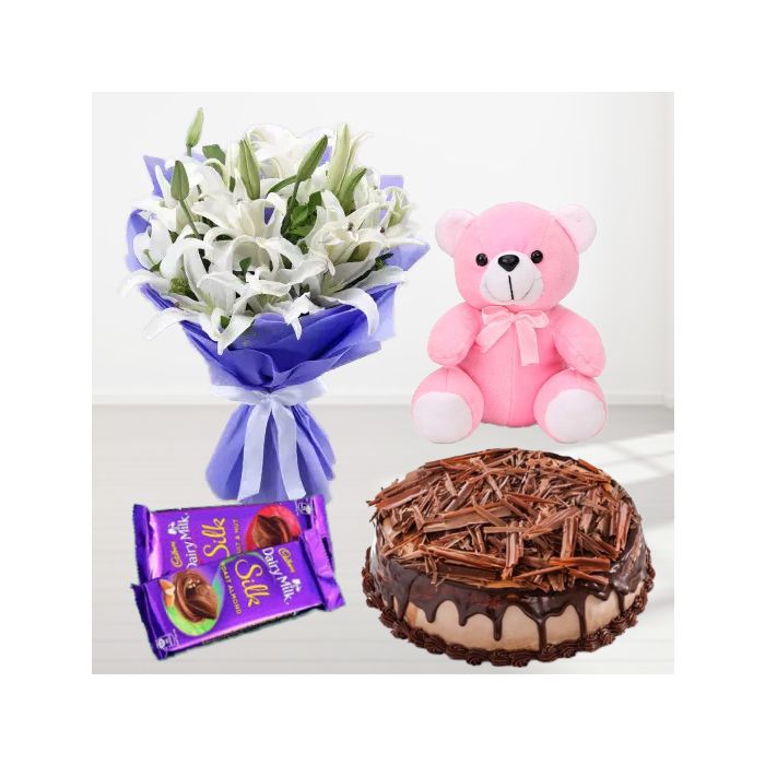 Looking for a beautiful and romantic gift for your loved one? Look no further than this stunning bunch of 10 white lilies, complete with a cute 6 inch pink teddy bear and delicious chocolate cheese cake. The perfect way to show your affection and make any special occasion even more memorable. Plus, we've added a set of 2 Dairy Milk Silk chocolates to make this gift even sweeter. Order now for fast, nationwide delivery.