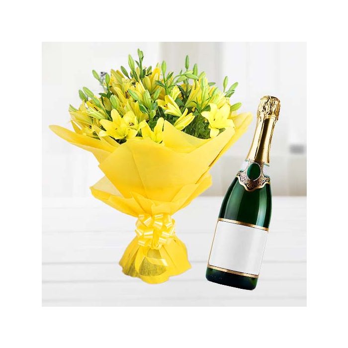 Product Description 5 | Bunch of 10 yellow asiatic lilies with bottle of champegne |
