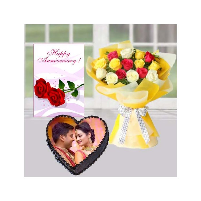 Looking for the perfect anniversary present? Look no further than this gorgeous bunch of 12 mix roses, heart shape photo cake, and anniversary greeting card! This stunning bouquet of flowers is guaranteed to put a smile on your loved one's face, and the delicious cake and card are sure to make this a day to remember. Order now and let that special someone know how much you care!