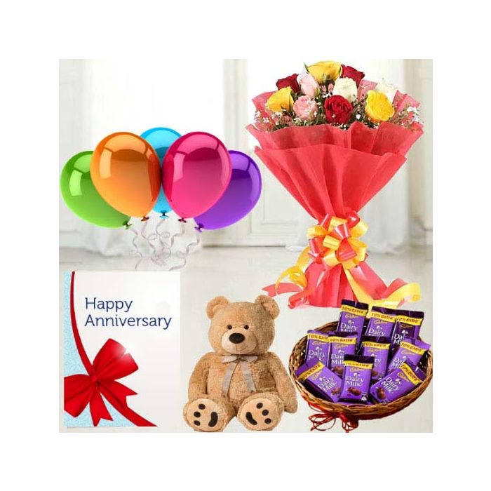 Bunch of 12 mix roses, 6 inch teddybear, Basket of dairy milk chocolates, anniversary greeting card with 5 blown balloons