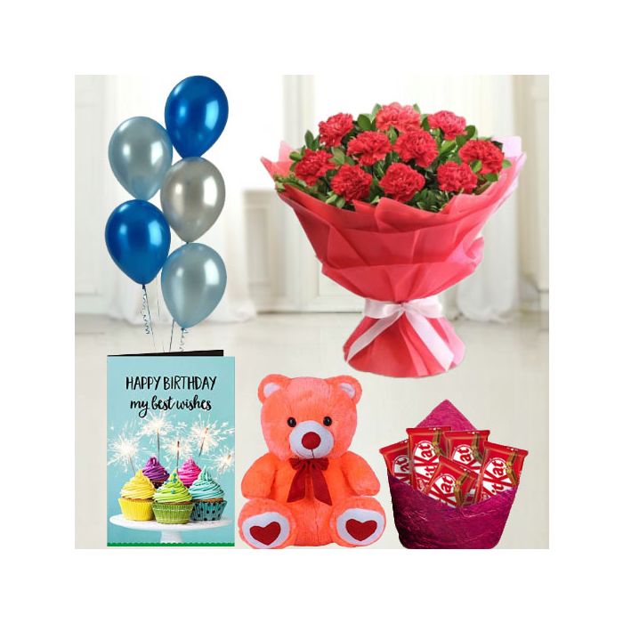 Bunch of 12 red carnations , 6 inch height teddybear , set of 5 kitkat chocolates, birthday greeting card with 5 blown balloons