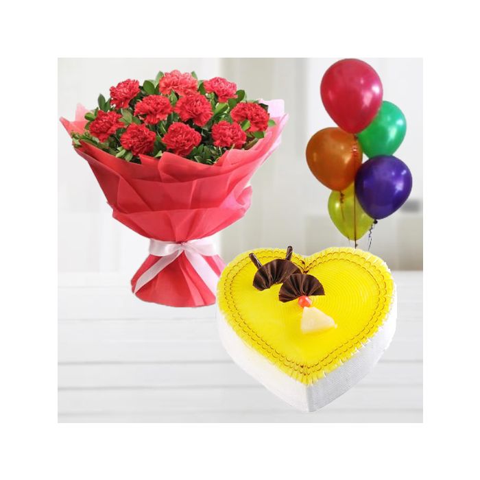 Looking for a lovely and unique gift for your special someone? Our Bunch of 12 red carnations with heart shape pineapple fresh cream cake with 5 blown balloons is the perfect choice! This gorgeous arrangement features vibrant red carnations and a delicious heart shaped pineapple fresh cream cake, all nestled together with 5 playful blown balloons. It's the perfect way to say "I love you" on any occasion!