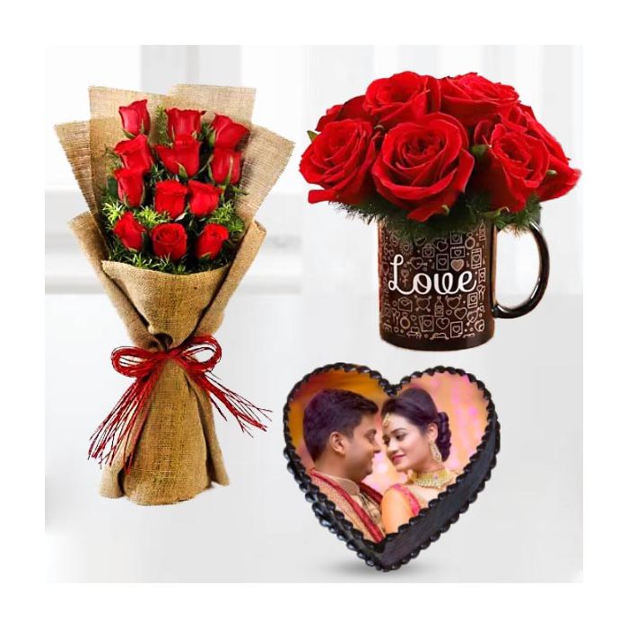A special someone deserves the Treat them with this unforgettable gift combo that is sure to make their day! Our Bunch of 12 red roses is the perfect way to show your love and affection. The 1 kg heart shape photo cake is a delicious chocolate cake that is covered in fondant and decorated with a red rose design. It's the perfect way to show your loved one how much you care! The 5 red roses arranged in a photo mug are a beautiful way to display your affection. This mug can be used for coffee, tea, or hot chocolate and is microwave and dishwasher safe.