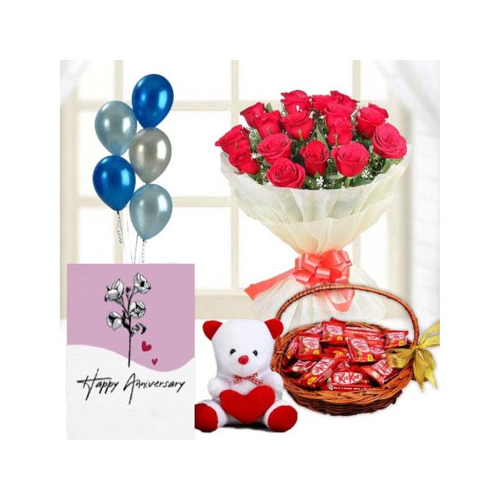This beautiful bunch of 12 red roses is the perfect way to show your loved one how much you care on your anniversary. The basket of 30 KitKat chocolates is a delicious way to sweeten the deal, and the 6 inch white teddybear is a adorable addition that will make this gift extra special. The anniversary greeting card with 5 blown balloons completes the package, making it a truly memorable gesture.