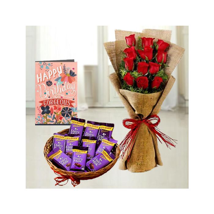 Looking for the perfect birthday gift? Look no further than this irresistible bundle! It includes a beautiful bunch of 12 red roses in jute packing, a basket of creamy dairy milk chocolates, and a charming birthday greeting card. This gift is sure to make any birthday extra special.
