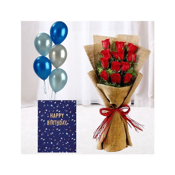 Bunch of 12 red roses in jute packing, bunch of 5 mix color balloons with birthday card