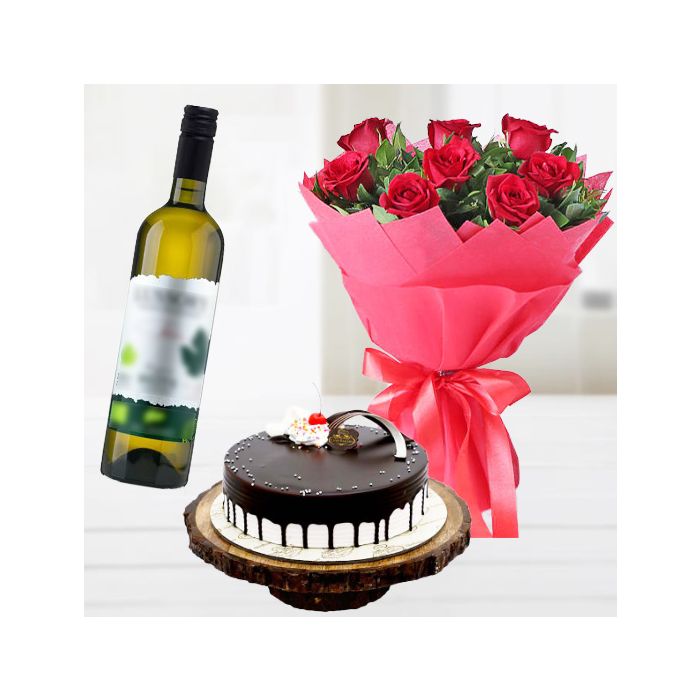 Product Description 5 | Bunch of 12 red roses with chocovanilla cake with bottle of white wine |