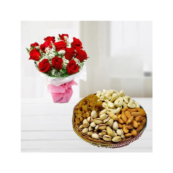 Here's the perfect way to show your special someone how much you care - a beautiful bunch of 12 red roses, paired with delicious half kg dryfruits. This luxurious gift is sure to make an impression, and is the perfect way to show your affection. The roses are freshly picked and beautifully arranged, and the dryfruits are of the highest quality. Indulge your loved one with this truly romantic gift.