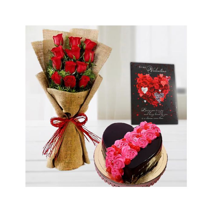 Bunch of 12 red roses with jute packing , 1 kg heart shape cake with floral topping , valentine greeting card