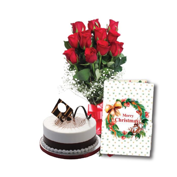 Looking for something special to give your loved one this Christmas? Look no further than this amazing bundle consisting of a dozen roses, a delicious chocolate cake, and a festive greeting card. The roses are a beautiful way to show your affection, while the cake is a delicious treat that will surely put a smile on their face. And what could be more thoughtful than a personalized Christmas greeting card? Order now and put the joy of Christmas in their hearts!
