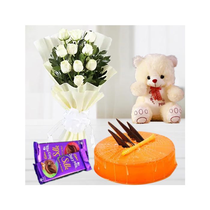 bunch of 12 white roses with 1 feet height teddybear with set of 2 dairy milk silk chocolates with orange cool cake