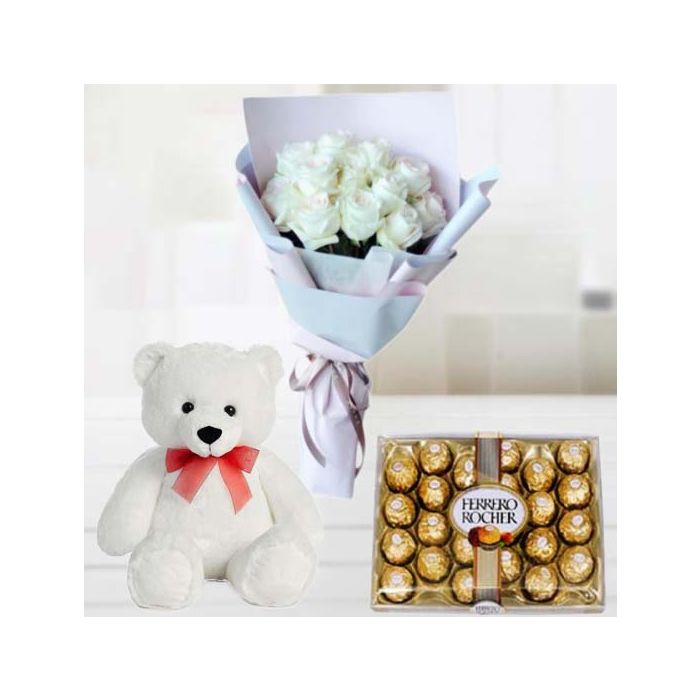 Bunch of 12 white roses with 6 inch teddy bear & 24 pcs ferrero rocher chocolate