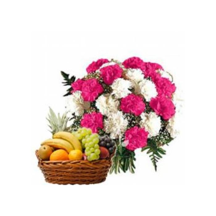 Welcome to our fruit and flower basket section. Our fruit and flower baskets are the perfect way to show your loved ones how much you care. This beautiful basket is brimming with 15 fresh carnations and a delicious fruit basket. It's the perfect way to show your affection and make someone's day extra special.