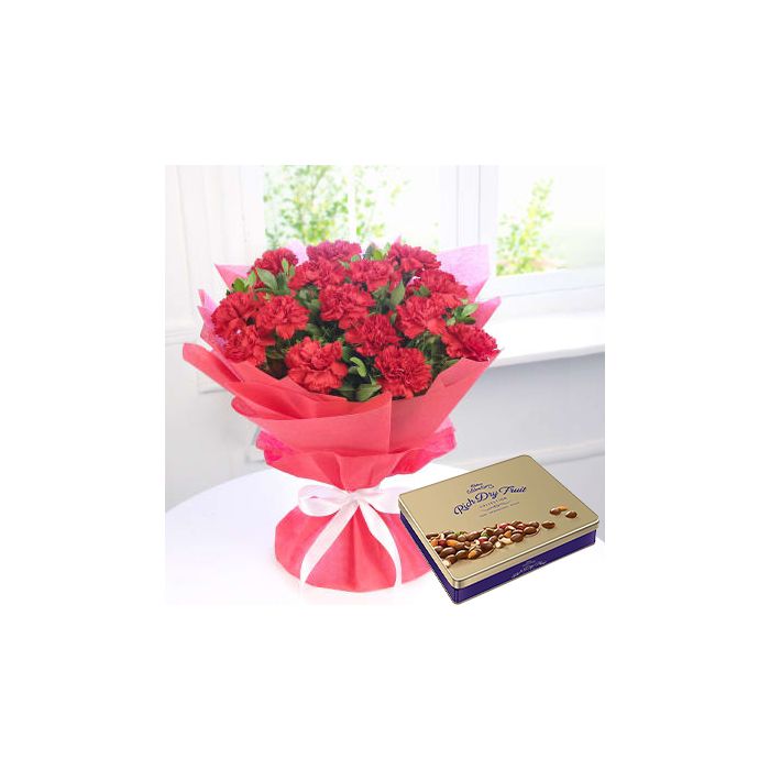 Bunch of 15 carnations with cadburys rich dryfruits chocolate box