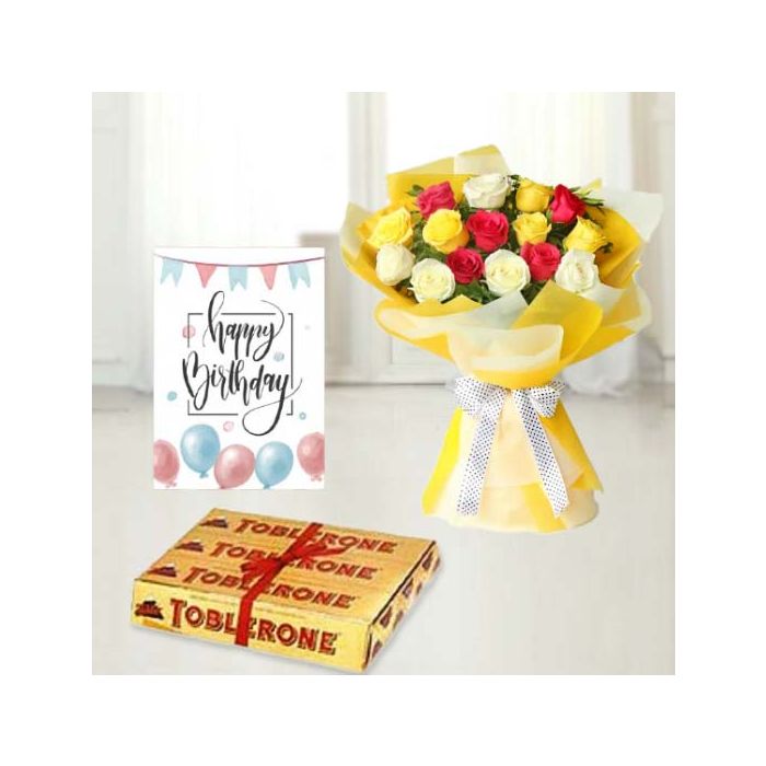 Bunch of 15 mix roses ,set of 3 toblerone chocolates , birthday greeting card