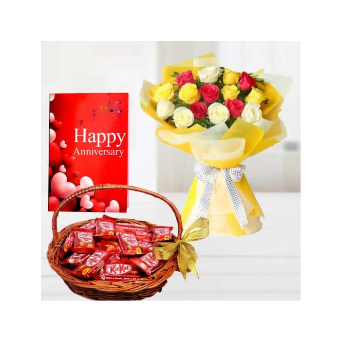 Bunch of 15 pink and white roses, Basket of 20 kit kat, anniversary greeting card