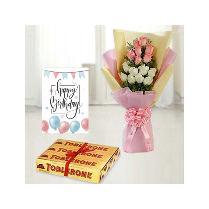 Bunch of 15 pink and white roses, set of 3 toblerone chocolates, birthday greeting card