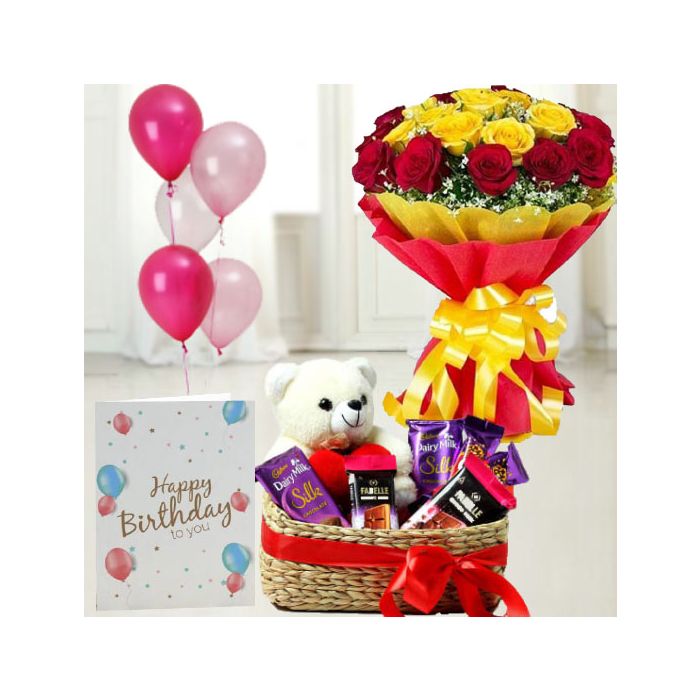 Bunch of 15 red and yellow roses, 6 inch teddybear sitting in chocolate basket with 4 silk , 2 fabelle chocolates, birthday Greeting card with 5 blown balloons