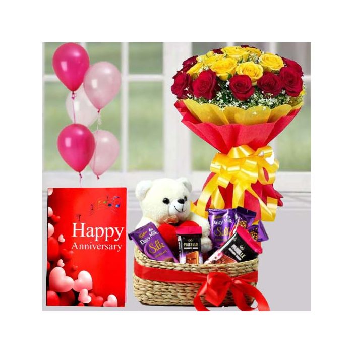Bunch of 15 red and yellow roses, 6 inch teddybear sitting in chocolate basket with 4 silk , 2 fabelle chocolates, Greeting card with 5 mix blown balloons