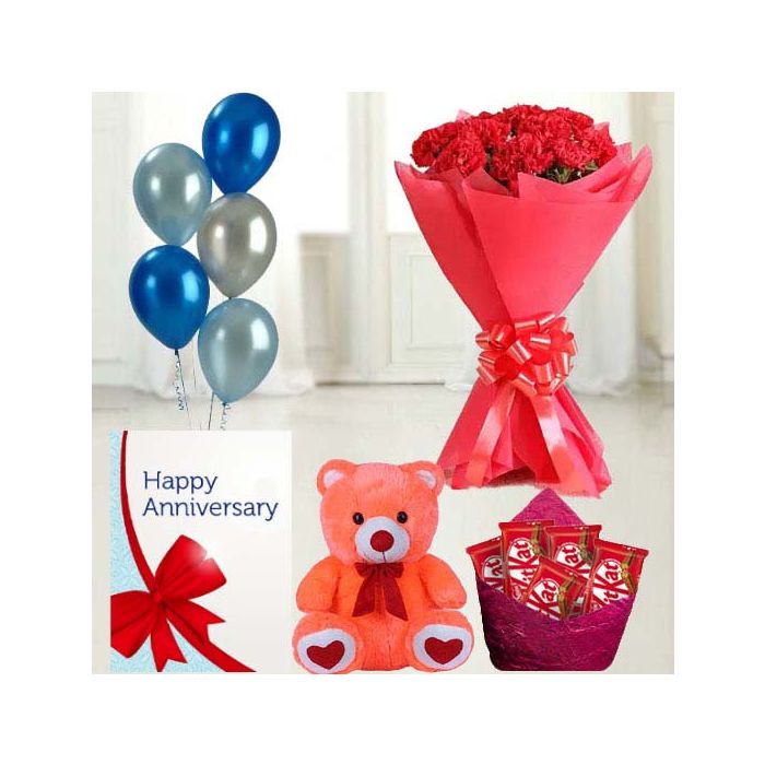 Bunch of 15 red carnations, 6 inch height teddy bear, set of 5 kitkat chocolates, anniversary greeting card with 5 blown balloons