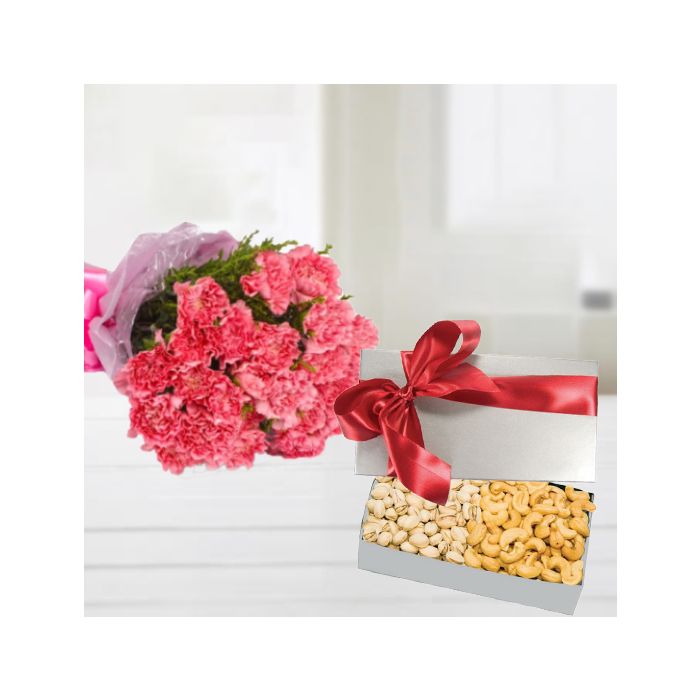 Looking for a gift that is both thoughtful and delicious? Look no further than this stunning bunch of 15 red carnations, paired with a basket of fresh cashews and pistachios. Perfect for any occasion, this gift is sure to please anyone who receives it.The carnations are beautiful and vibrant, representing happiness and love. They will surely bring a smile to the recipient's face. The basket of cashews and pistachios is both a tasty and healthy treat. It is also a great source of protein, making it perfect for snack time.