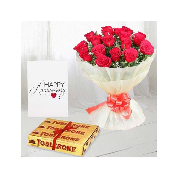 Bunch of 15 red roses, set of 3 toblerone chocolates, anniversary greeting card