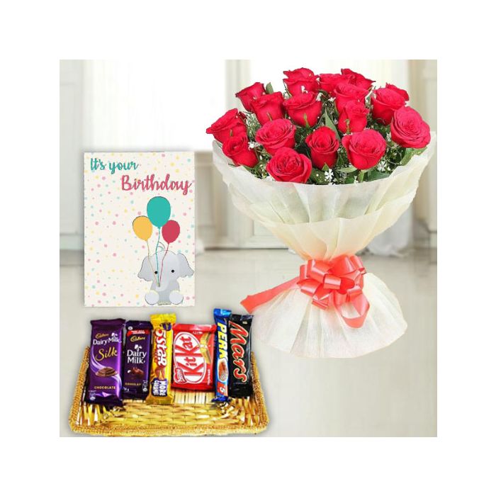 Bunch of 15 red roses, basket of assorted chocolates, birthday greeting card