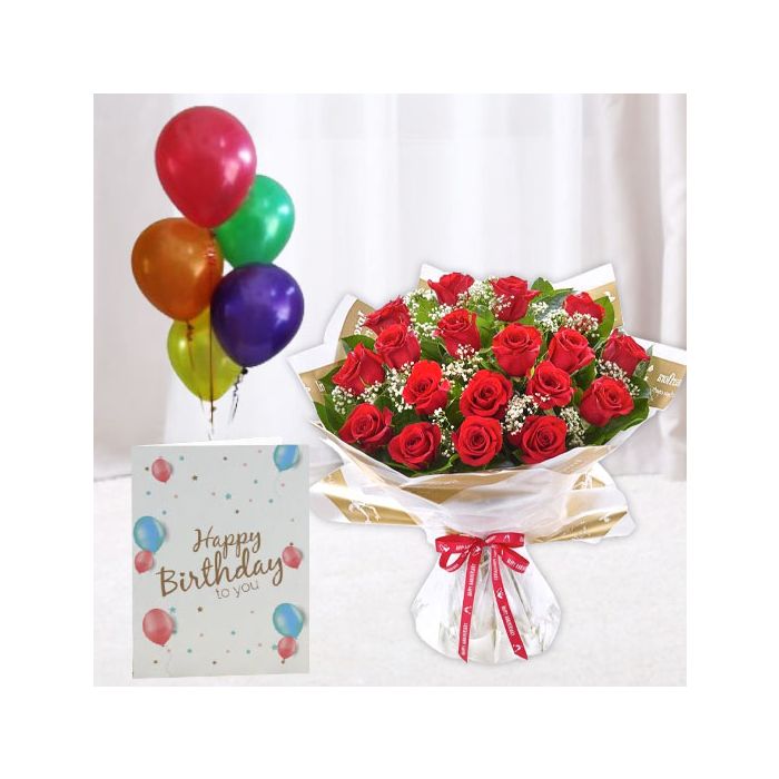 Whether you're celebrating a birthday, an anniversary, or just showing someone how much you care, this Bunch of 15 red roses, bunch of 5 mix color balloons with birthday card is the perfect way to show your loved ones how much you care. It includes a beautiful bunch of 15 red roses and a colorful bunch of 5 mix color balloons, along with a birthday card to make the occasion even more special. The recipient is sure to appreciate the thoughtfulness and love that went into this gift.