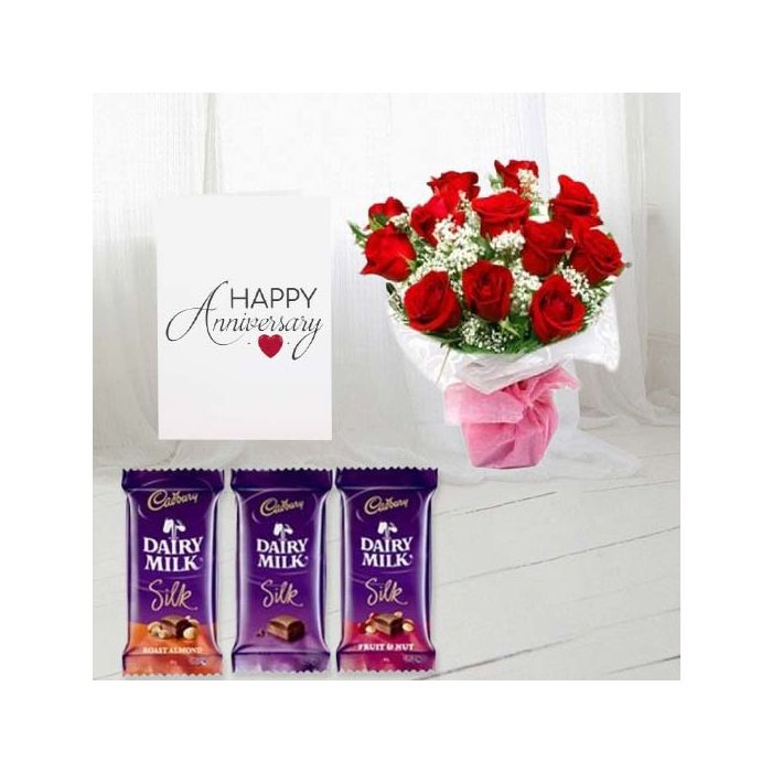 Bunch of 15 red roses, set of 3 dairy milk silk chocolates, anniversary greeting card