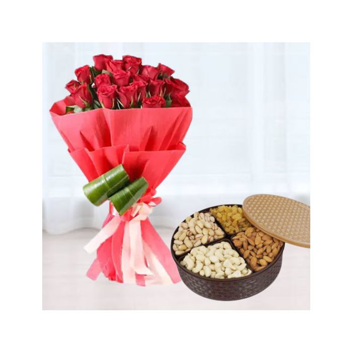 Looking for the perfect way to show your loved ones how much you care? Look no further than this stunning bunch of 15 red roses, accompanied by a delicious array of 1 kg assorted dryfruits. Whether it's a special anniversary, birthday, or simply a way to say 'I love you', this gift is sure to make a lasting impression. The vibrant red roses are expertly arranged and beautifully presented, making this a gift that is as elegant as it is thoughtful. The delicious assortment of dryfruits is the perfect accompaniment, making this an all-round winner. Order now for a gift that is sure to please.
