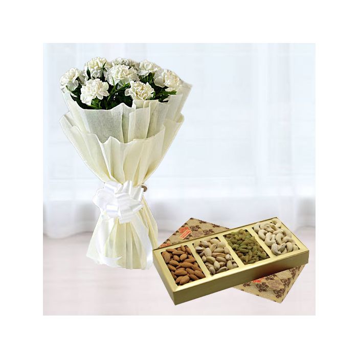 Product Description 5 | Bunch of 15 white carnations with box of assorted dryfruits |