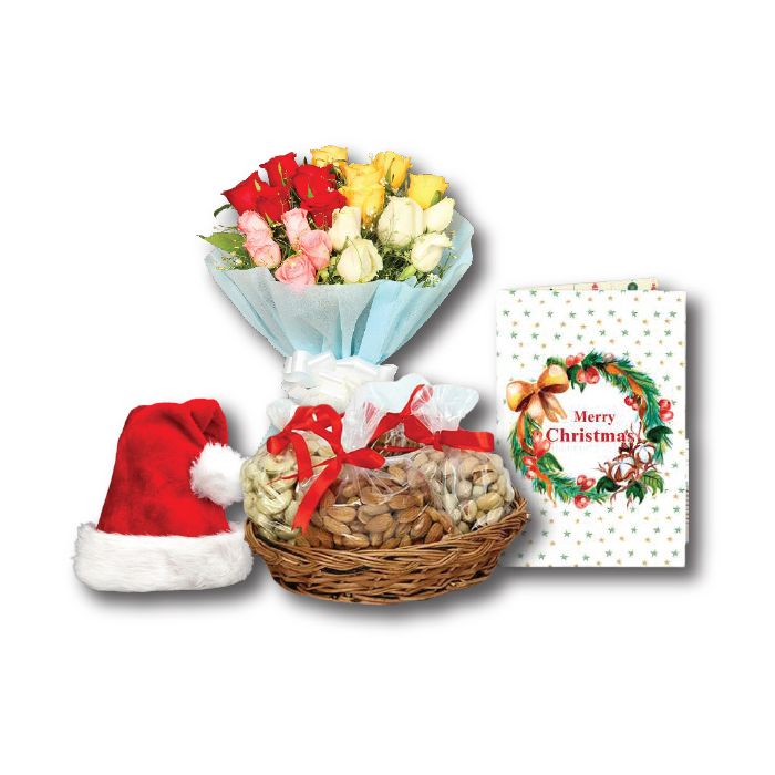 Bunch Of 20 Mix Color Carnations With 1 Kg Assorted Dry Fruits And Santa Claus Cap