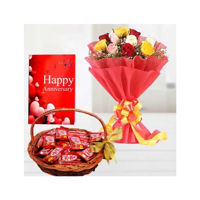 Bunch of 20 mix roses ,Basket of 20 kit kat, anniversary greeting card