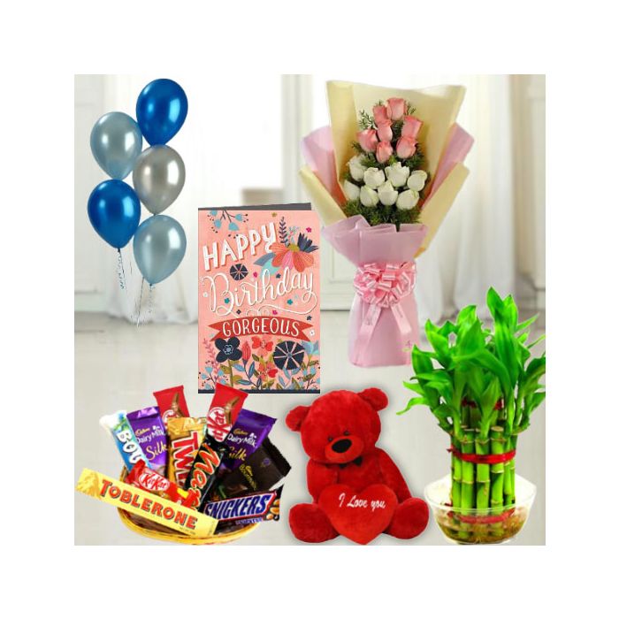 Bunch of 20 pink and white roses, 1 feet height red teddybear,basket of assorted chocolates, 2 layer Lucky bamboo plant ,5 blown balloons with birthday greeting card