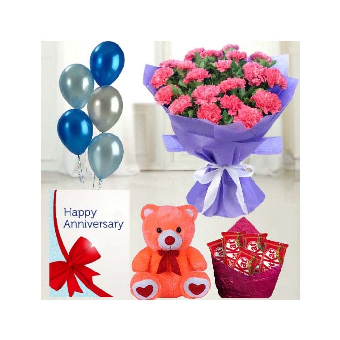 Bunch of 20 pink carnations, 6 inch height teddybear, set of 5 kitkat chocolates, anniversary greeting card with 5 mix blown balloons
