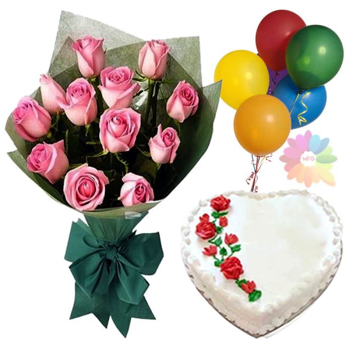 Welcome to our flowers and cake shop! We are excited to offer this special bundle of 20 pink roses with a heart-shaped pineapple fresh cream cake and 5 blown balloons. This is the perfect gift for any special occasion, like an anniversary, birthday, or even just to say "I love you." The roses are beautiful and fresh, and the cake is moist and delicious. The balloons add a fun touch and show just how much you care. Order today and we'll deliver this special gift right to your door.
