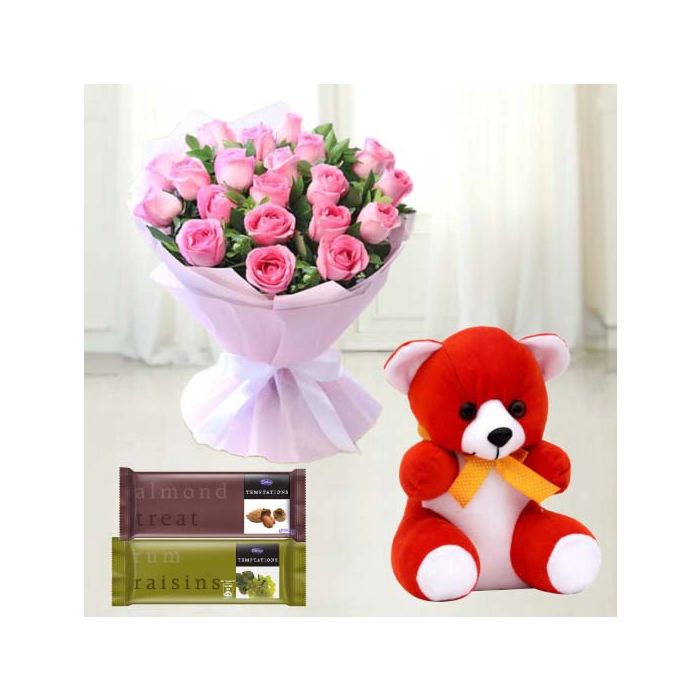 bunch of 20 Pink roses with pair of 2 temptations chocolates with 6 inch teddybear