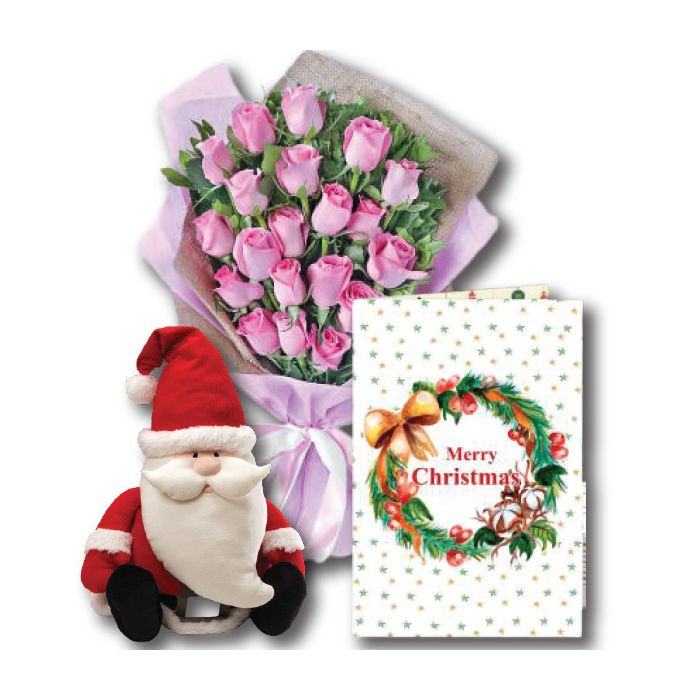 Product Description 1 | Bunch Of 20 Pink Roses With Santa Claus Soft Toy And Christmas Greeting Card |