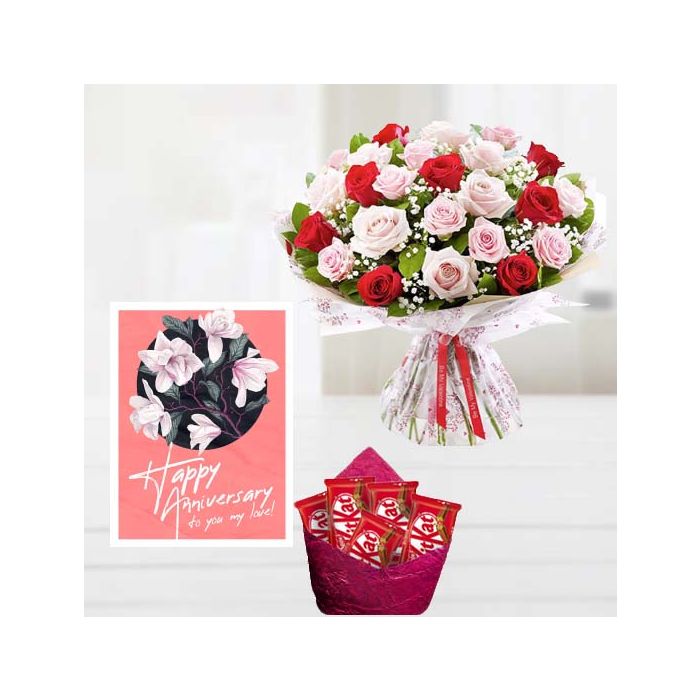 Bunch of 20 red and pink roses, pack of 5 kitkat chocolates, anniversary greeting card