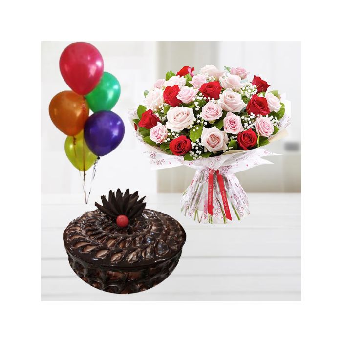 Product Description 5 | Bunch of 20 red and white roses with double chocolate cake with 5 blown balloons |