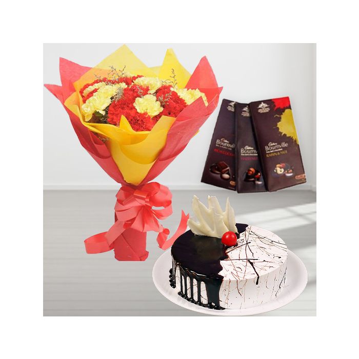 Welcome to our paradise of flowers and chocolates! Here we have the perfect bunch of 20 red and yellow carnations, freshly picked and beautifully arranged with 3 delicious bournville chocolates. If that's not enough to tantalize your taste buds, we've also included a chocovanilla cake, which is sure to satisfy any sweet tooth. So whether you're treating yourself or someone special, this is the ultimate gift! Thank you for choosing us!