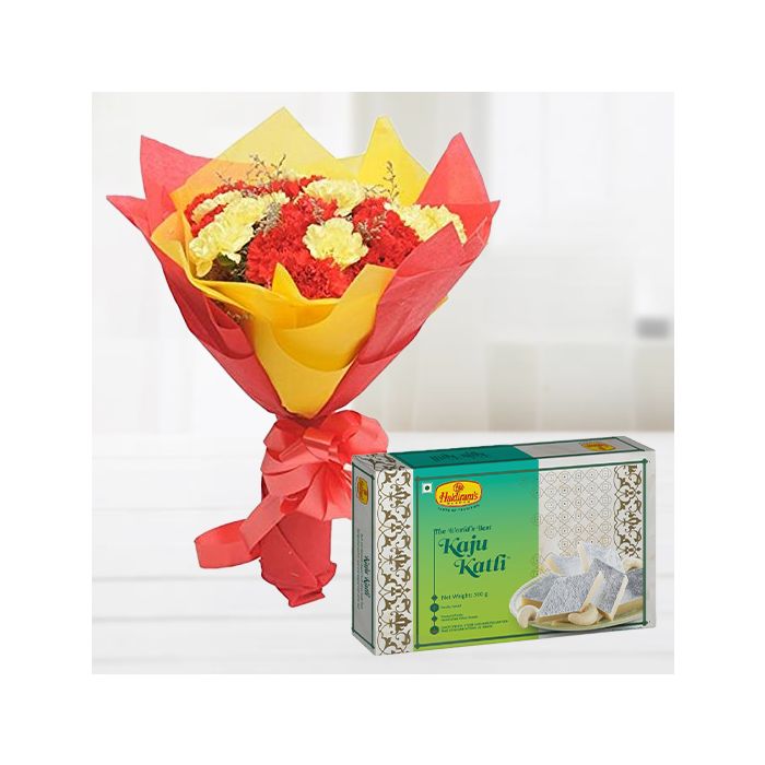 Product Description 5 | Bunch of 20 red and yellow carnations with box of 1 kg kaju katli |