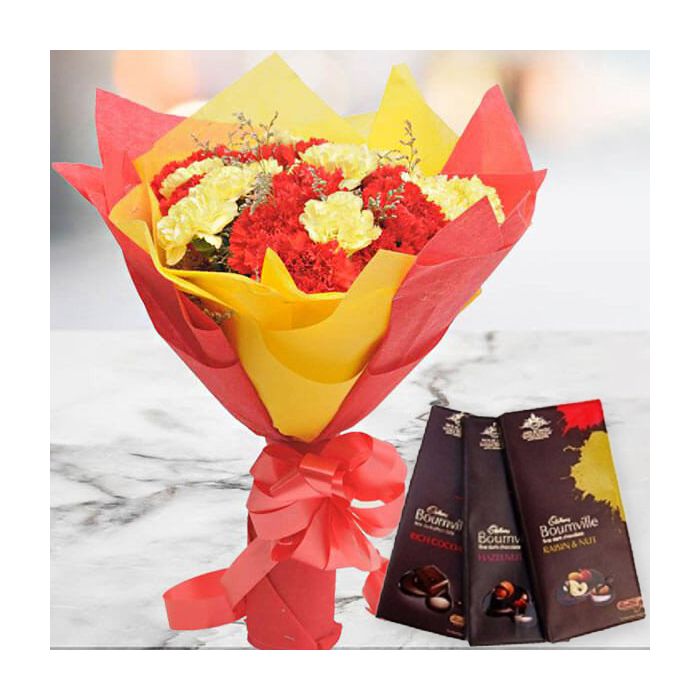 Product Description 5 | Bunch of 20 red and yellow carnations with set of 3 bournville dark chocolates |