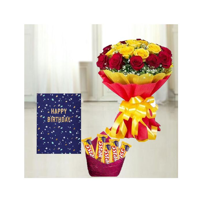 Bunch of 20 red and yellow roses, pack of 5 Fivestar chocolates, birthday Greeting card