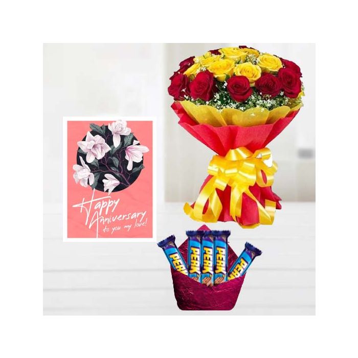 Bunch of 20 red and yellow roses, pack of 5 perk chocolates, anniversary Greeting card